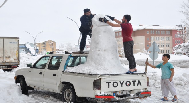 Hakkari’nin Yüksekova ilçesinde yaşayan Feyzi Bakin, pikap tarzı aracının arkasında yaptığı 2 metrelik kardan adamla şehir turu attı.