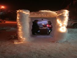 Erzincan’da 4 gündür etkili olan kar yağışı kent merkezini beyaza bürünmesiyle birlikte karın keyfini sürmek isteyenler ilginç görüntülerin ortaya çıkmasına neden oldu. Ordu Caddesi üzerinde uzun yıllardır hizmet veren petshop sahibi Serkan Akpınar (36), bir arkadaşı ile birlikte yaklaşık 7 saatte eskimoların kullandığı ve 'iglo' denilen kardan ev yaptı. İçerisine iki kişinin rahatlıkla girebileceği evi rengarenk ışıklarla süsleyen işletme sahibi, vatandaşların büyük ilgi gösterdiğini ve hatıra fotoğrafı çektirdiklerini söyledi.