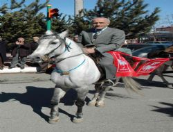 Demokrat Parti (DP) Erzurum Palandöken İlçe Belediye Başkan Adayı Müfit Özbeyli, seçim çalışmalarını at üzerinde yapıyor. Kırat'a binerek Palandöken bölgesinde seçmenleri ziyaret eden Özbeyli, 29 Mart ile birlikte kıratın yeniden şahlanacağını söylüyor.