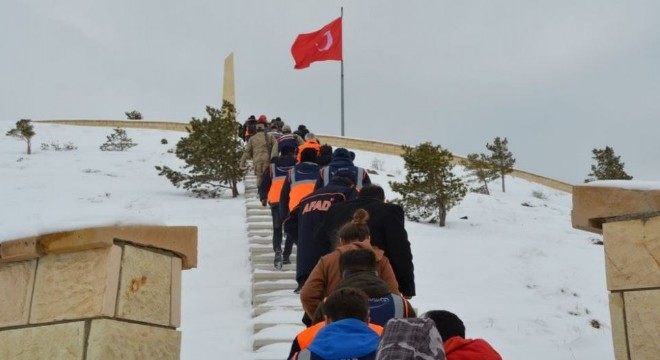 Kop Şehitleri Abidesi’ni ziyaret eden üniversite öğrencileri ve AFAD gönüllülerine Kop Savunması hakkında tarihi bilgiler verirken, Kop şehitlerinin kahramanlıklarından esinlenerek kaleme aldığı şiiri okuyan Jandarma Kıdemli Başçavuş Hacı Ali Balcı, ziyaretçilere duygusal anlar yaşattı.