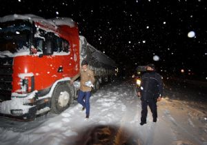 Yoğun kar yağışı nedeniyle 2 bin 409 rakımlı Kop Dağı Geçidi’nin ulaşıma kapanmasıyla Bayburt’ta mahsur kalan TIR şoförlerine Bayburt Belediyesi zabıta ekipleri tarafından yemek dağıtıldı.