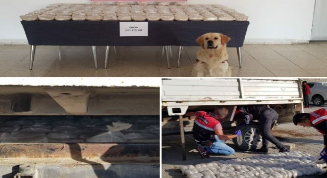 Van İl Jandarma Komutanlığı ekiplerince yapılan çalışmalar sonucunda koyun yüklü bir kamyonette 101 kilo 213 gram eroin ele geçirildi.