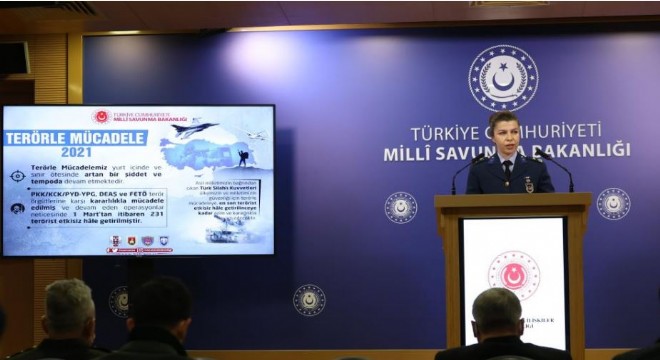 Milli Savunma Bakanlığı’nda basın bilgilendirme toplantısı düzenlendi. Toplantıda yapılan açıklamada, “Artan bir şiddet ve tempoda kararlıkla devam eden terörle mücadelemiz kapsamında 1 Mart tarihinden itibaren yurtiçinde ve sınır ötesinde PKK/KCK/YPG/PYD ve FETÖ başta olmak üzere DEAŞ dahil terör örgütlerine karşı kararlılıkla mücadele edilmiş ve devam eden operasyonalar neticesinde 231 terörist etkisiz hale getirilmiştir” ifadeleri kullanıldı.