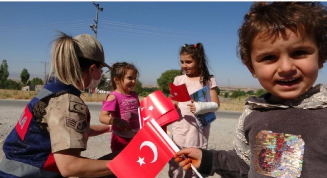 Uzun bir süredir korona virüs tedbirleri kapsamında yüz yüze eğitimden uzak olan öğrenciler, ilk ders ziliyle 2021-2022 eğitim-öğretim yılına başladı. Eğitime başlayan öğrencilere sürpriz yapan jandarma ekipleri, merkeze 18 kilometre uzaklıktaki Taşoluk İmam Hatip Ortaokulu önünde çocukları karşılayarak onlara bayrak, balon ve boyama kitabı hediye etti. Çocuklara maske, mesafe ve hijyen konularında uyarıda bulunan Mehmetçikler, öğrencilerin ilk gün heyecanına ortak oldu. Çocuklar, ekiplerin beraberinde getirdikleri dedektör köpekleri sevip, fotoğraf çektirerek, güne yüksek motivasyonla başladı. Hediyelerini alan çocuklar, okul bahçesine geçerek, İstiklal Marşı’nın okuyup ardından sınıflarına geçerek ders başı yaptı.
