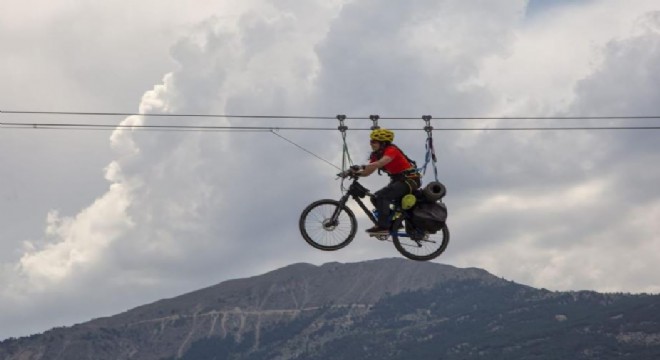 Metrelerce yükseklikte bisikletiyle Zipline yaptı