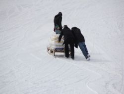 Erzurum merkezden aldıkları çuval dolusu unları Palandöken Kayak Merkezinin girişine kadar taksiyle getiren vatandaşlar kapalı olan yolun kalanını ise kızakla tamamlıyorlar.
