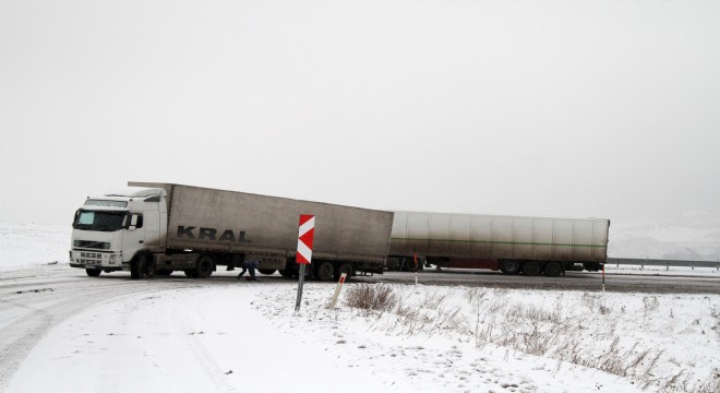 Ardahan’ın Çıldır ilçesinde Mozaret Geçidinde etkili olan kar yağışı ve buzlanma nedeniyle tırlar yolda kaldı.