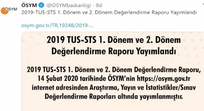 2019-TUS-STS 1’inci dönem ve 2’nci dönem değerlendirme raporu, 14 Şubat itibarıyla ÖSYM’nin ‘ http://osym.gov.tr ’ internet adresinden Araştırma, Yayın ve İstatistikler/Sınav Değerlendirme Raporları altında yayımlandı. Raporda 2019-TUS- STS’nin detaylı analizleri ve üniversitelerin bu sınavlardaki başarı sıralamaları yer alıyor.