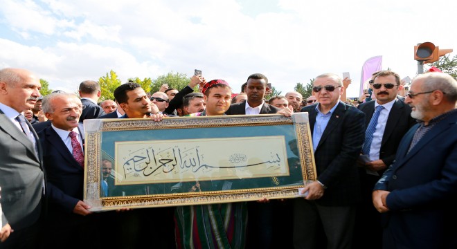 Atatürk Üniversitesi Rektörü Prof. Dr. Ömer Çomaklı, Cumhurbaşkanı Recep Tayyip Erdoğan'a hat sanatıyla yapılan Besmele lafzı hediye etti.