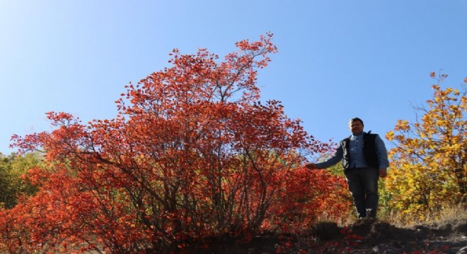 Oltu ilçesine bağlı Arıtaş Mahallesi'nde sonbaharın gelişiyle birlikte doğa adeta kırmızıya büründü. Meralarda bulunan kaplaç (yabani kiraz) ağaçları, bu yıl sarı yerine kırmızıya dönen yapraklarıyla kartpostallık görüntüler oluşturdu.