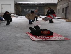 Yağış nedeniyle kayganlaşan yolları fırsat bilen çocuklar, bu durumu en iyi şekilde değerlendirmek için soluğu cadde ve sokaklarda alıyorlar. Çevreden topladıkları naylonlarla ve evden getirdikleri kızaklarla saatlerce kayarak karın keyif çıkartıyorlar.