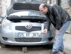 Merkez Yakutiye İlçesine bağlı Çaykara Caddesinde park halindeki 25 AF 361 plakalı otomobilin motor kısmına giren enik, bir süre sonra girdiği yerden çıkamaz oldu. Çaresiz kalınca miyavlayarak adeta insanlardan yardım isteyen kedi, sesini çevredeki esnafa duyurmayı başardı.