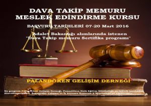Adalet Bakanlığı personel alımlarına yönelik olarak, Palandöken Gelişim Derneği ve Palandöken Halk Eğitim Müdürlüğü tarafından işbirliği yöntemiyle düzenlenen “Dava Takip Memuru Kurs ve sertifika programına ait başvuruların 07-20 Mart 2016 tarihleri arasında Çalışma ve İş Kurumu Erzurum İl Müdürlüğü’ne yapılacağı belirtildi.