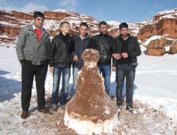 ERZURUM (İHA) - Erzurum’un Narman ilçesinde doğal güzellikleriyle bilinen kırmızı peri bacaları, yağan karla birlikte kartpostallık manzaralar oluştururken, gençler ve çocuklar kar ve kırmızı toprağı bir araya getirerek kardan adam yaptı.