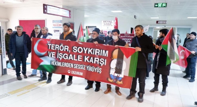 İsrail'in Gazze'ye yönelik saldırılarını protesto etmek amacıyla Erzurum'da görevli sağlık çalışanları sessiz yürüyüşlerinin 14. haftasında bir araya geldiler.