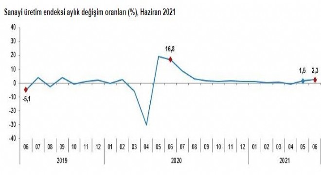 2021 yılı Haziran ayında madencilik ve taşocakçılığı sektörü endeksi bir önceki yılın aynı ayına göre yüzde 24,3, imalat sanayi sektörü endeksi yüzde 24,8 ve elektrik, gaz, buhar ve iklimlendirme üretimi ve dağıtımı sektörü endeksi yüzde 13,9 arttı.