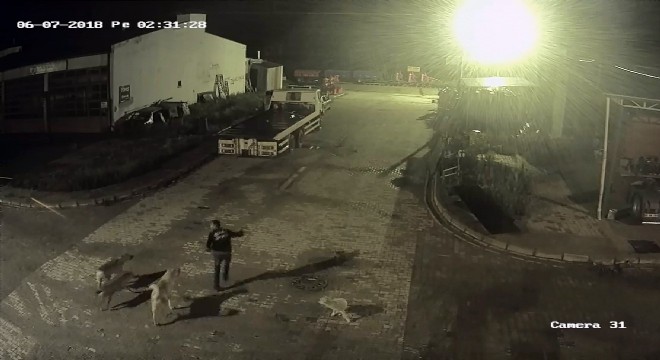 Güvenlik kamerasına yansıyan görüntülerde sanayi sitesinde yiyecek arayan kurdu fark eden köpeklerin vahşi hayvanı kovalaması ve ardından sanayi sitesinin güvenlik görevlisinin telaşla bulunduğu yerden çıkarak kurdu uzaklaştırması yer alıyor.