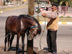 Erzurum’da yaklaşık 10 gün süren yağmur yağışı ardından iki gündür etkili olan sıcak hava insanlar kadar hayvanları da etkilerken, sıcaktan bunaldığı için hırçınlaşan at, sahibi tarafından hortumla yıkandı. Bosna Caddesi üzerinde, kaldırım kenarındaki direğe bağladığı atına yaklaşık 20 dakika su tutan hayvan sahibi, "Sıcak hava atı çarptı. Huysuzlaşıyor. Hortumun suyuyla feraha kavuşuyor" dedi.