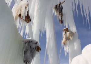 Sibirya soğuklarının hüküm sürdüğü Erzurum'da suyla soğuk havanın bütünleşmesi sonucu ortaya çıkan buz sanatının içerisindeki kesik hayvan başları görenler şaşkına döndü.