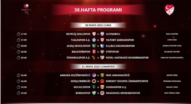 Spor Toto 1. Lig’in 2021-2022 sezonu 38. haftasında oynanacak maçların programı duyuruldu. Türkiye Futbol Federasyonu resmi internet sitesinden açıklanan mücadele programı şu şekilde: