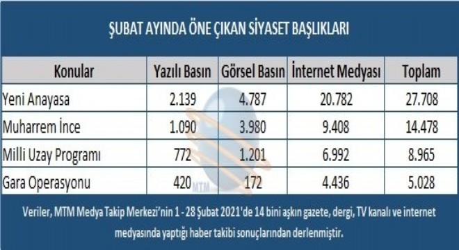 MTM, şubat ayı toplumsal ve siyasi gelişme raporunu açıkladı. Cumhurbaşkanı Recep Tayyip Erdoğan’ın Yeni Anayasa çağrısı Şubat ayının en çok konuşulan siyasi başlığı oldu. CHP eski Milletvekili Muharrem İnce’nin CHP ile yolları ayırması da Şubat ayı siyaset gündeminin diğer bir önemli başlığı olurken, Türkiye’nin Milli Uzay Programı ve ilk yerli sürücüsüz otobüs tanıtımı da gündemde bolca yer buldu.