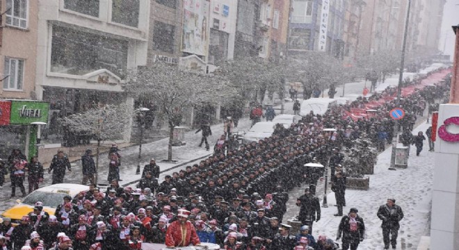 Tüm yurtta eş zamanlı olarak düzenlenen ’Gençlik Şühedanın İzinde’ etkinliği çerçevesinde Kırıkkaleli vatandaşlar, lapa lapa yağan karın altında Sarıkamış şehitleri anma programı kapsamında polis ve askerler ile birlikte yürüdü.