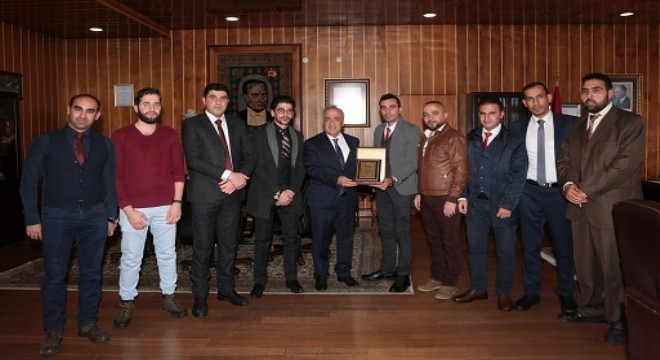 Ziyaretin sonunda Suriyeli öğrenciler, Rektör Çomaklı’ya teşekkürlerini sunarak plaket takdim ettiler.
