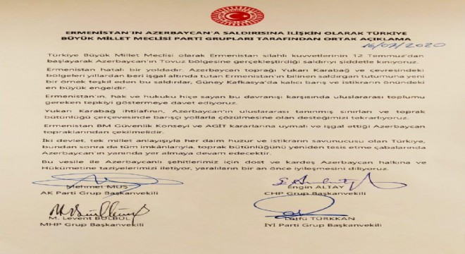 AK Parti, CHP, MHP ve İYİ Parti grupları ortak açıklama yayınlayarak Ermenistan'ın Azerbaycan'a yönelik saldırısını kınadı.