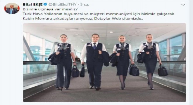Türk Hava Yolları Genel Müdürü Bilal Ekşi, sosyal medya hesabı Twitter üzerinden yaptığı paylaşımla THY bünyesinde görevlendirilmek üzere kabin memuru alımının yapılacağını açıkladı. Ekşi, yaptığı paylaşımda, “Bizimle uçmaya var mısınız? Türk Hava Yollarının büyümesi ve müşteri memnuniyeti için bizimle çalışacak Kabin Memuru arkadaşları arıyoruz. Detaylar Web sitemizde” açıklamasında bulundu.