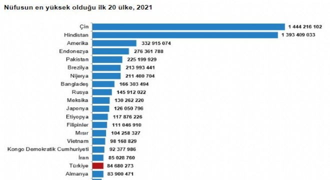Türkiye, nüfus büyüklüğüne göre sıralamada 195 ülke arasında 18. sırada yer aldı