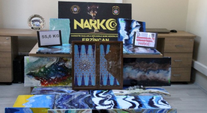 Erzincan’da polisin yaptığı yol uygulamasında narkotik köpeğinin tepki vermesi üzerine yapılan aramada yağlı boya tablolara sıkıştırılmış 55,6 kg. metamfetamin uyuşturucu ele geçirildi.