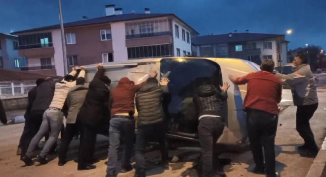 Erzurum’da bir araç, şoförünün direksiyon hakimiyetini kaybetmesi sonucu takla attı. Takla atan aracın sesini duyan mahalle sakinleri ise ters dönen aracı bir araya gelerek düzeltti.