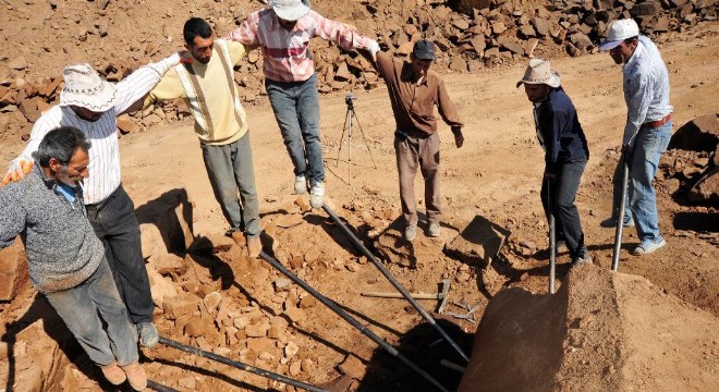 Bitlis'in Ahlat ilçesinde taş ustaları, Ahlat taşını çıkarmak için güneşin altında ocaklarda zorlu çalışmalarını sürdürüyor.
