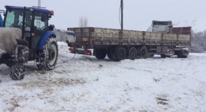 Erzurum’un güney ilçelerinde hayvancılıkla geçimini sağlayan vatandaşların kış çilesi sürüyor. Tırlarla başka köylere ot nakli yapan besiciler zaman zaman kar ve buz nedeniyle zorlanıyor. Kara saplanan ve buzda ilerlemekte güçlük çeken tırların imdadına traktörler yetişiyor. Yolda kalan tırlar halatla traktöre bağlanarak çekiliyor. Uzun süren uğraşlar sonrası tır ve kamyon araçları traktörler yardımı ile yola devam ediyor.