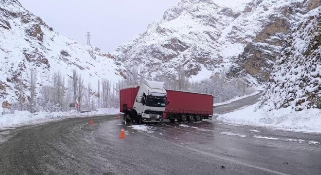Tortum ilçesi Derekapı mevkisinde Trabzon'dan İran'a gitmekte olan İran plakalı bir tır, buzlanma nedeniyle virajı alamayarak ters şeride dönüp makasladı.