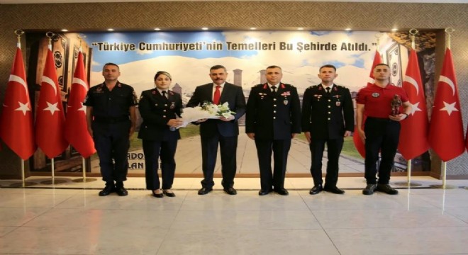 Erzurum Valisi Mustafa Çiftçi’de, Jandarma Teşkilatı'nın kuruluşunun 185. yıl dönümü münasebetiyle İl Jandarma Komutanı Tuğgeneral Metin Düz ve beraberindeki jandarma personelini makamında kabul etti.