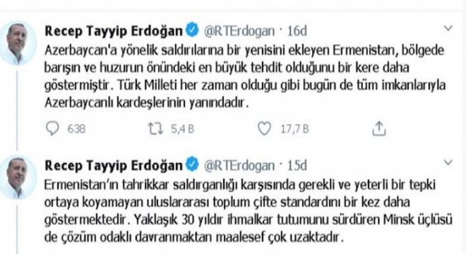 Sosyal medya hesabından açıklamalar yapan Cumhurbaşkanı Erdoğan, “Azerbaycan'a yönelik saldırılarına bir yenisini ekleyen Ermenistan, bölgede barışın ve huzurun önündeki en büyük tehdit olduğunu bir kere daha göstermiştir. Türk Milleti her zaman olduğu gibi bugün de tüm imkanlarıyla Azerbaycanlı kardeşlerinin yanındadır. Ermenistan’ın tahrikkar saldırganlığı karşısında gerekli ve yeterli bir tepki ortaya koyamayan uluslararası toplum çifte standardını bir kez daha göstermektedir. Yaklaşık 30 yıldır ihmalkar tutumunu sürdüren Minsk üçlüsü de çözüm odaklı davranmaktan maalesef çok uzaktadır” ifadelerini kullandı.