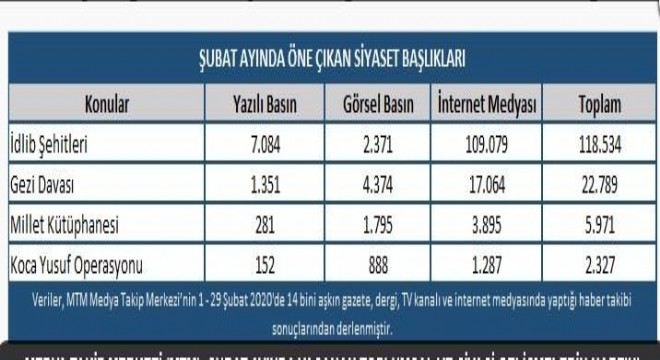 Medya Takip Merkezi'nin (MTM) yaptığı araştırmaya göre Şubat ayında yaşanan olaylar arasında Türkiye, en çok İdlib’de şehit verdiği askerlerini konuştu. Gezi Parkı davasında 9 sanığın beraat etmesi, Şubat ayının gündeminde yer alan gelişmelerden biriydi. Başarıyla gerçekleştirilen Koca Yusuf Operasyonu da diğer bir gündem başlığıydı.