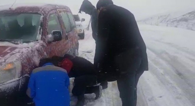 Buzlanan yolda seyretmekte güçlük çeken sürücüler zincir takarak yollarına devam edebildiler.