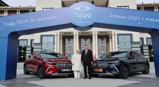 Cumhurbaşkanı Erdoğan ve eşi Emine Erdoğan, üzerinde Cumhurbaşkanlığı forsu olan "Gemlik" renkli Togg makam aracı ve Emine Erdoğan'a ait 34 EE 2071 plakalı "Anadolu" renkli Togg'un önünde poz verdi.