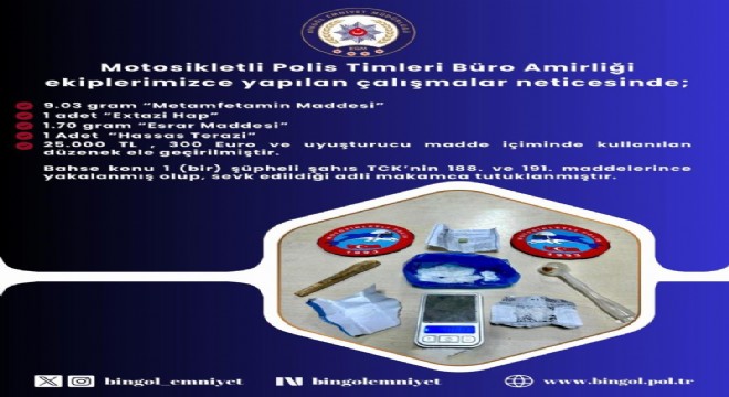 Bingöl’de Narkotik Suçlarla Mücadele ve Asayiş Şube Müdürlüğü ekiplerince koordineli şekilde gerçekleştirilen operasyonda, 1 şüphelinin üzerinden ve ikametinde farklı tür ve miktarlarda uyuşturucu ile uyarıcı madde ele geçirildi. Gözaltına alınan şüpheli, emniyetteki işlemlerinin ardından sevk edildiği adli makamlarca tutuklanarak cezaevine gönderildi.
