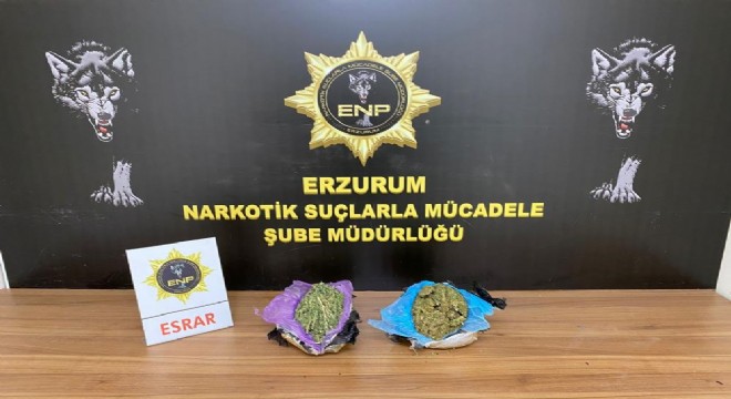 Erzurum-Erzincan karayolu üzerinde batı illerine uyuşturucu madde nakli yapan şahıslara yönelik yapılan şüpheli araç ve şüpheli şahıs analiz çalışmalarına istinaden Kahramanmaraş-Hopa seferini yapan yolcu otobüsü durduruldu. Yapılan kontroller esnasında otobüsün bagaj bölümünde bulunan valize narkotik madde arama köpeği Eris’in tepki vermesi üzerine yapılan aramada 2 parça halinde 1 kilo 840 gram esrar maddesi ele geçirildi.