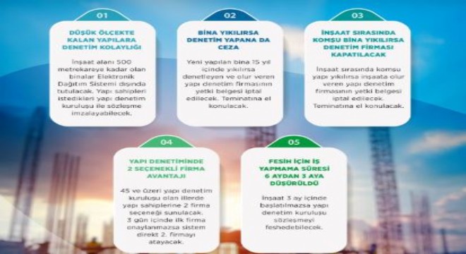 Çevre, Şehircilik ve İklim Değişikliği Bakanlığı’nın hazırladığı “Yapı Denetimi Uygulama Yönetmeliği” ile “Dağıtım Tebliği” ve “Ceza Tebliğinde” değişiklik yapıldı. Resmi Gazete’de yayımlanan değişiklikler ile 500 metrekare altı yapıların yapı denetim hizmetinden faydalanması için kolaylık sağlandı. Ceza tebliğinde yapılan düzenleme ile yeni yapılan bina 15 yıl içinde yıkılırsa ya da inşaat sırasında komşu yapının yıkımına neden olunursa yapı denetim firmasının faaliyetine son verilecek. Dağıtım tebliğindeki değişiklik ile de 45 ve üzerinde yapı denetim kuruluşuna sahip olan illerde iki alternatifli denetim kuruluşu ataması yapılabilecek.