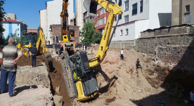 Erzurum şehir merkezinde bir binanın temel hafriyatının alınması esnasında iş makinesinin aniden devrilmesi ve ters dönmesi herkesi korkuttu.