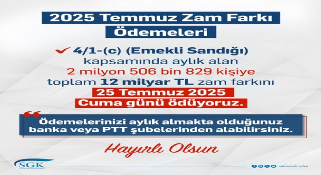Sosyal Güvenlik Kurumu, sosyal medya hesabından Emekli Sandığı kapsamında aylık alanların zam farkı ödemesine ilişkin açıklama yaptı. Yapılan açıklamada, "4/1-(c) (Emekli Sandığı) kapsamında aylık alan 2 milyon 506 bin 829 kişiye toplam 12 milyar lira zam farkını 25 Temmuz Cuma günü ödüyoruz. Ödemelerinizi aylık almakta olduğunuz banka veya PTT şubelerinden alabilirsiniz" ifadelerine yer verildi.