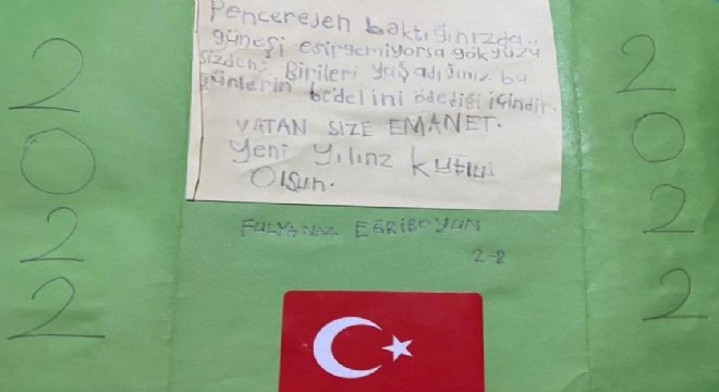 İlkokul 2. Sınıf öğrencisi Sıraç Pirecioğlu ise hayalinin asker veya polis olmak olduğunu anlatarak, “Ailenizden, sıcak yuvanızdan uzakta gece, gündüz; kar, kış demeden bizleri koruyan yiğit, kahraman asker abilerim yeni yılınız kutlu olsun. Rabbim ayağınıza taş, gözünüze yaş değdirmesin. Allah’ım hepinizi korusun, yar ve yardımcınız olsun inşallah. Tüm sevdiklerinize kavuşmayı nasip etsin. Hayalim sizin gibi asker veya polis olmak, gurur duyulan bu mesleği yapmak. Vatanımız size emanet. Hepinize selamlar, yolunuz açık olsun. Allah’a emanet olun.” ifadelerini kullandı.